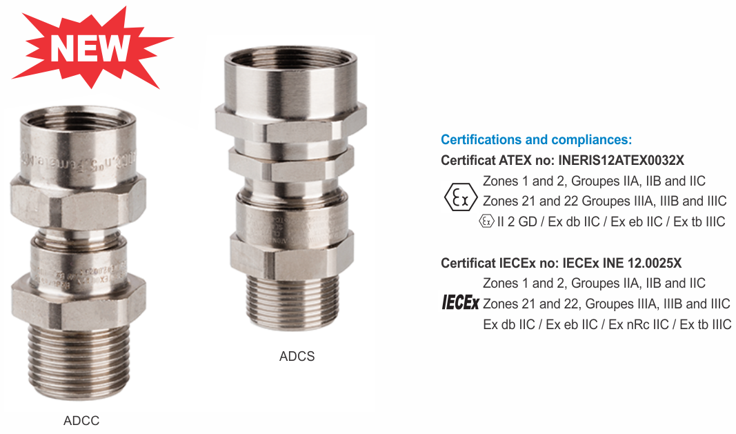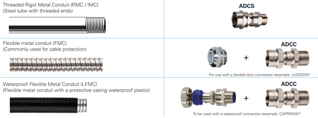 ADCC là đầu nối cố định phù hợp với tất cả các loại cáp không bọc giáp trong ống dẫn cứng và mềm. ADCS có thiết kế xoay, cho phép sử dụng với các ống dẫn cứng dài. Nên sử dụng kết hợp với đầu nối thích hợp cho ống dẫn mềm linh hoạt.