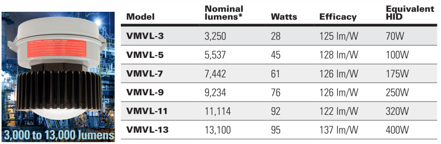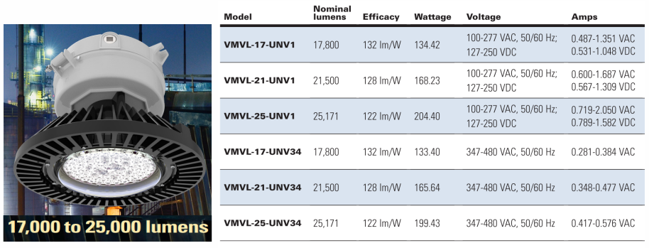 Series đèn LED Champ VMVL và VMV là thiết bị chiếu sáng của Division Crouse-Hinds thuộc tập đoàn Eaton dành cho đèn chiếu sáng high và mid bay downlight khu vực nguy hiểm Class I và Class II. Các sản phẩm này nằm trong khoảng từ 3.000 lumen đến 25.000 lumen, với chiều cao lắp đặt từ 2 đến 18 mét.