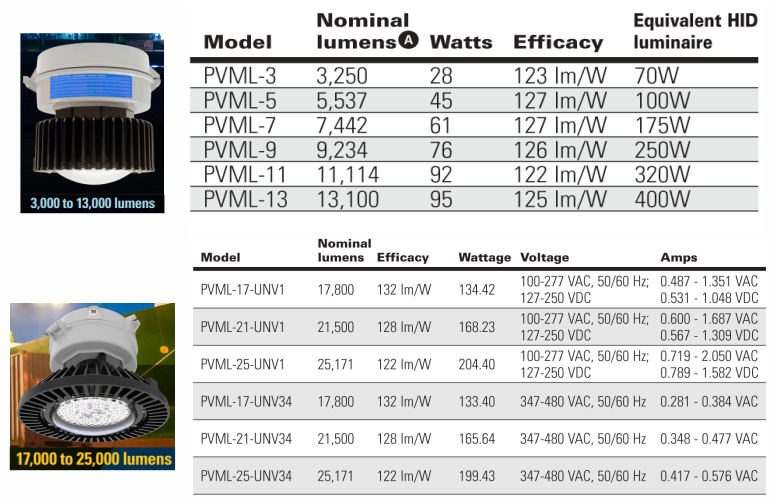 Các mẫu có sẵn nằm trong khoảng từ 3.000 lumen đến 25.000 lumen. Điều này cung cấp giải pháp chiếu sáng cho các khu vực có chiều cao lắp đặt từ 2 đến 18 mét. Thiết bị cố định theo tiêu chuẩn NEMA 4X cung cấp tới 127 lumen trên mỗi watt.