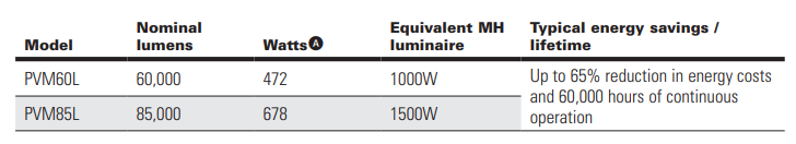 PVM LED high bay cấu hình thấp có sẵn các kiểu 60.000 lumen và 85.000 lumen, đồng thời cung cấp 132 lumen/watt. Hệ thống quang học được thiết kế chính xác mang lại khả năng chiếu sáng hiệu quả cao, tùy chọn phân bố ở các khu vực: hẹp, trung bình, rộng và cực rộng đảm bảo hiệu suất vượt trội.