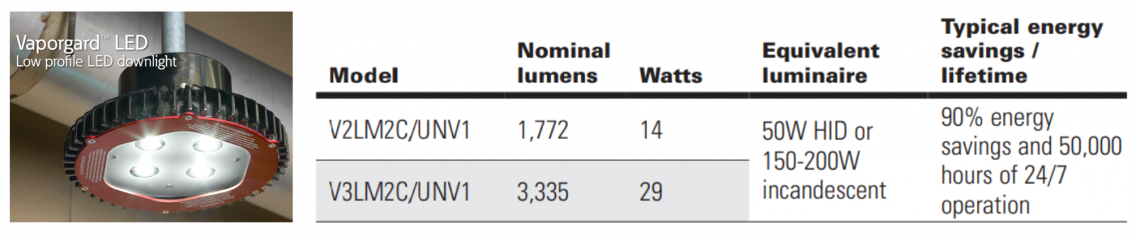 Đèn Vaporgard LED có các kiểu 1.700 và 3.300 lumen, với các tùy chọn nhiệt độ màu là trắng mát, trắng trung tính và trắng ấm. Sử dụng bốn dãy đèn LED công suất cao, độ sáng cao, bộ đèn này mang lại mức ánh sáng tương tự như đèn sợi đốt 50W HID hoặc 150-200W.