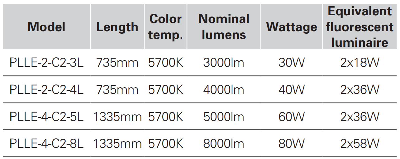 Sản phẩm sử dụng chip LED chất lượng cao đảm bảo tuổi thọ thiết bị lâu dài. Yêu cầu bảo trì và mức tiêu thụ năng lượng thấp, PLLE LED mang lại hiệu suất vượt trội so với các thiết bị đèn huỳnh quang truyền thống.