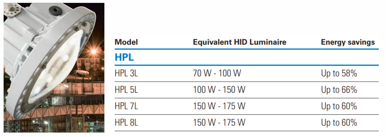 Đèn LED HPL đảm bảo hoạt động tốt, tuổi thọ và hiệu suất chiếu sáng cao. Các module LED cung cấp hơn 100 lumen/Watt, tiết kiệm chi phí năng lượng lên đến 66%. Sản phẩm với 4 model khác nhau đạt đến 8.000 lumen.