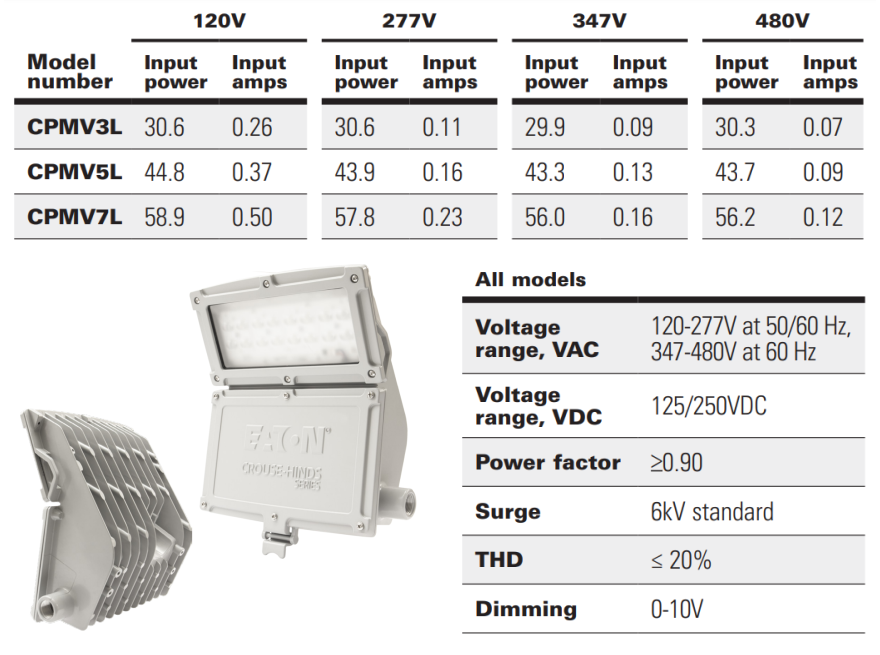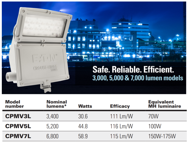 Đèn LED Champ CPMV ốp tường cung cấp khả năng chiếu sáng tốt, không cần bảo trì, tuổi thọ và hiệu suất cao trong các khu vực Class I, Division 2 và Class II, Division 1. Chúng có độ sáng từ 3.000 đến 7.000 lumen, được thiết kế cho các điều kiện khắc nghiệt và nguy hiểm.