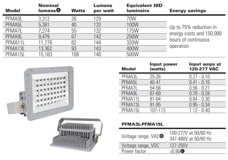 Đèn PFM / PFMA LED được thiết kế với vỏ nhôm đúc sơn tĩnh điện epoxy loại 4X, lý tưởng cho chiếu sáng khu vực chung gắn trên tường/cột ngoài trời, nơi có rung động, bụi, độ ẩm, môi trường ăn mòn và nhiệt độ khắc nghiệt.