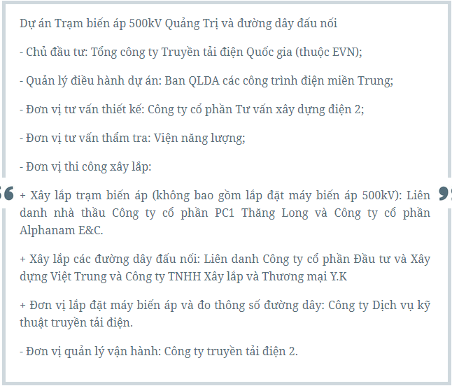 Dự án Trạm biến áp 500kV Quảng Trị và đường dây đấu nối Quảng Trị - rẽ Vũng Áng - Đà Nẵng được Tập đoàn Điện lực Việt Nam (EVN) giao cho EVNNPT làm chủ đầu tư, CPMB thay mặt EVNNPT quản lý dự án. Dự án có tổng mức đầu tư 965 tỷ đồng. Đây là công trình điện cấp bách trong Quy hoạch phát triển điện lực Quốc gia nhằm mục tiêu đảm bảo cung cấp điện cho phụ tải khu vực.